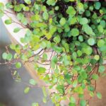 Wire Vine (Muehlenbeckia axillaris) It has small, glossy, dark green leaves sit densely along thin, wiry stems with a striking bronze to copper hue. Excellent for rock gardens, ground cover, hanging baskets, or as a trailing accent in pots. It is considered as a fast-growing, low-growing broadleaf evergreen shrub. Blooms are small yellowish-white in Summer, followed by shiny black berries. Drought Tolerant once established. It’s considered pet-friendly and non-toxic to cats and dogs.