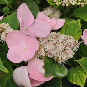 Soft pink lace cap blooms with scalloped edges and white highlights. Dark green foliage. May turn lavender in acidic soil.