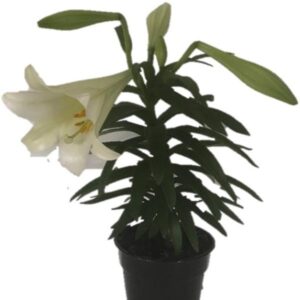 | Plant Category: | EASTER LILY - Nellie | Species: | Lilium longiflorum | Exposure: | Bright, indirect light indoors; Full Sun–Part Shade outdoors | Height: | 18-24" | Color: | White | Sizes Available: | 1 Gallon |