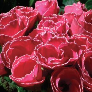 Double rose-pink blooms with a white edge resembles mini roses unfurl above deep green foliage, releasing a sweet fragrance. A beautiful choice for spring displays, containers, or as a charming gift plant.