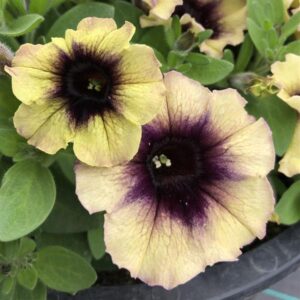 | Plant Category: | PETUNIA - Semi-Trailing | Species: | hybrid | Exposure: | Full Sun | Height: | 8-12" | Color: | Creamy Yellow w/ Deep Purple | Sizes Available: | 4.5 inch, 10" Basket |